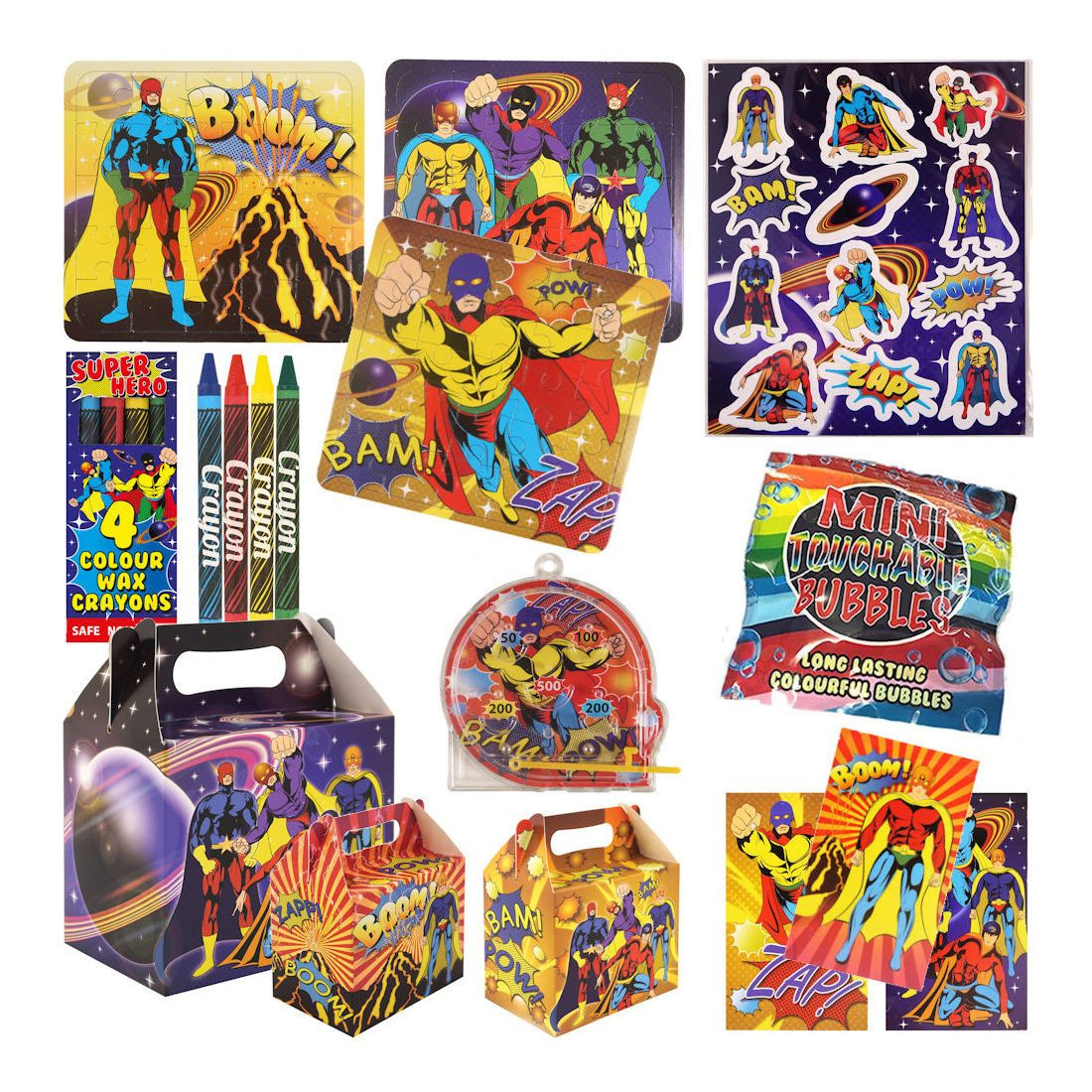 Henbrandt 10 STUKS | KANT-EN-KLARE Gevulde SUPER HERO Traktatiedozen INCLUSIEF Uitdeel Kado's. Bestaande uit: Uitdeelbox, Krijtjes, Notitieblok, Flipperspel, Puzzel, Stickervel en Bellenblaas | Jongens | Tractatiedozen voor Verjaardagen en Kinderfeestjes