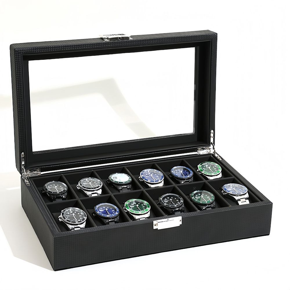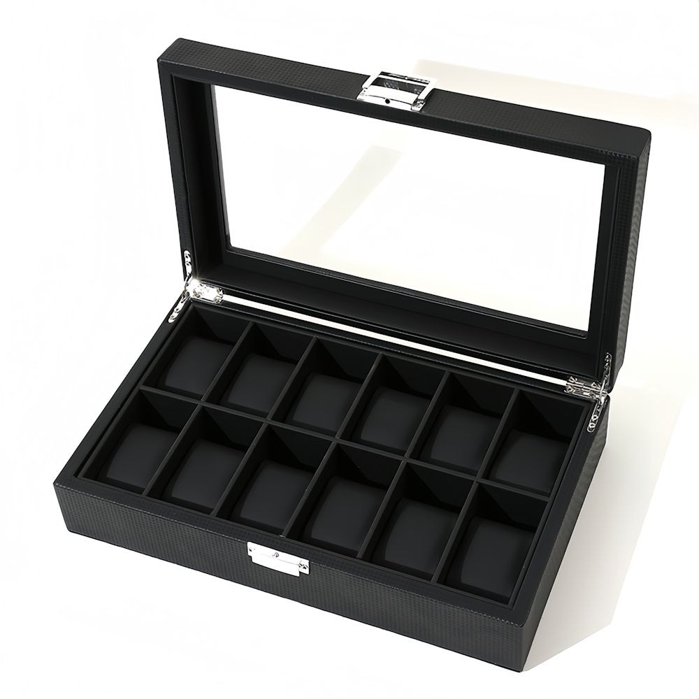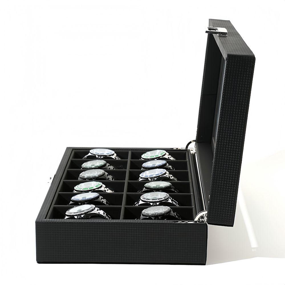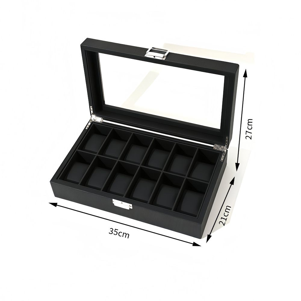 De horlogebox is vervaardigd uit duurzaam PU-leder en uitgevoerd in klassiek zwart, met een luxe zwarte binnenvoering en zwarte inleg. De zachte horloge opbergdoos beschermt jouw horloges tegen stof, krassen en beschadigingen. Dankzij de 12 ruime vakken heeft elk horloge zijn eigen plek en blijven ze netjes gescheiden.