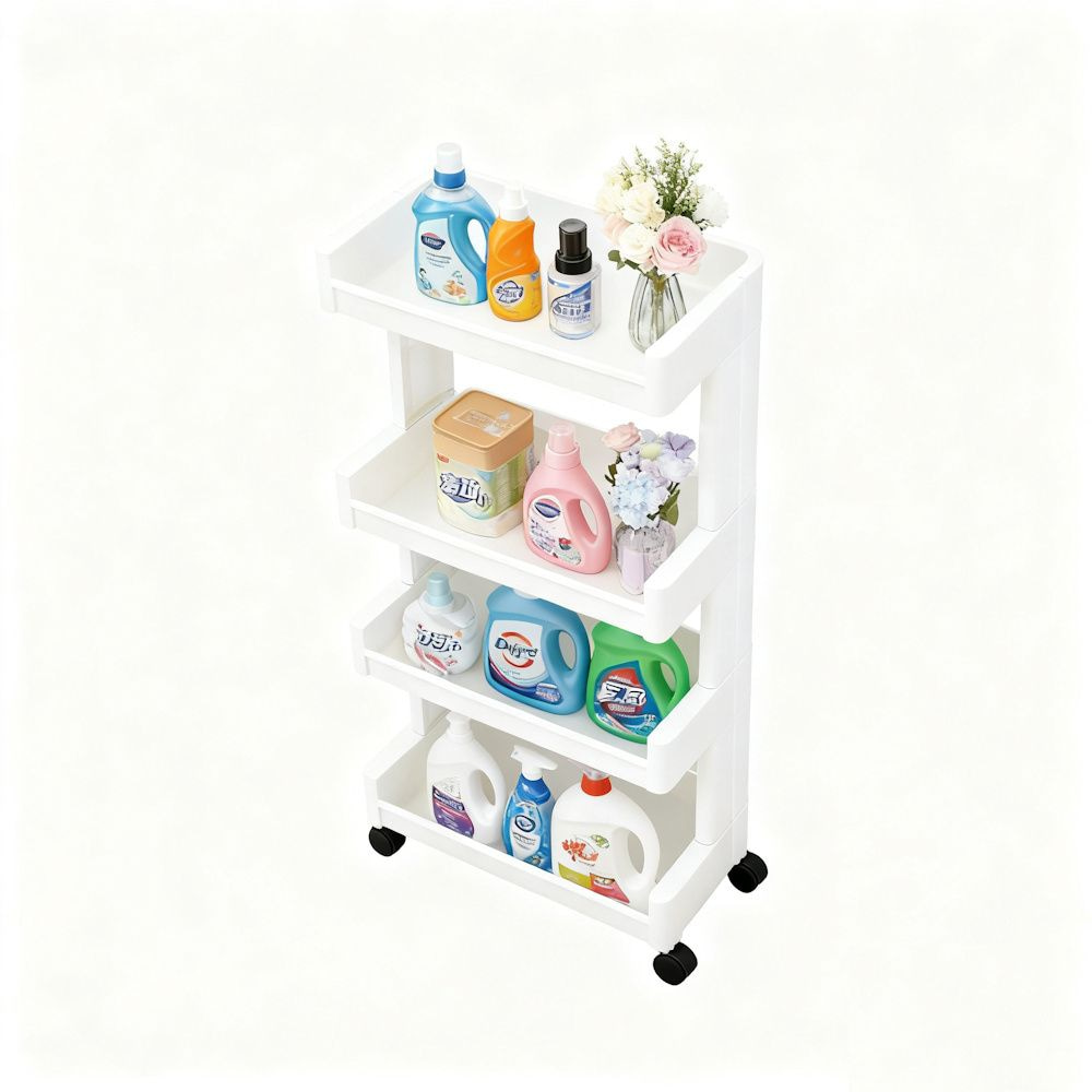 Smal Opbergrek 4 laags op Wieltjes met 4 Open Vakken, Ruimtebesparende Opberg Rek Organizer voor Keuken of in uw Badkamer. Praktisch opbergrekje, hij is smal en past perfect in die smalle ruimte.