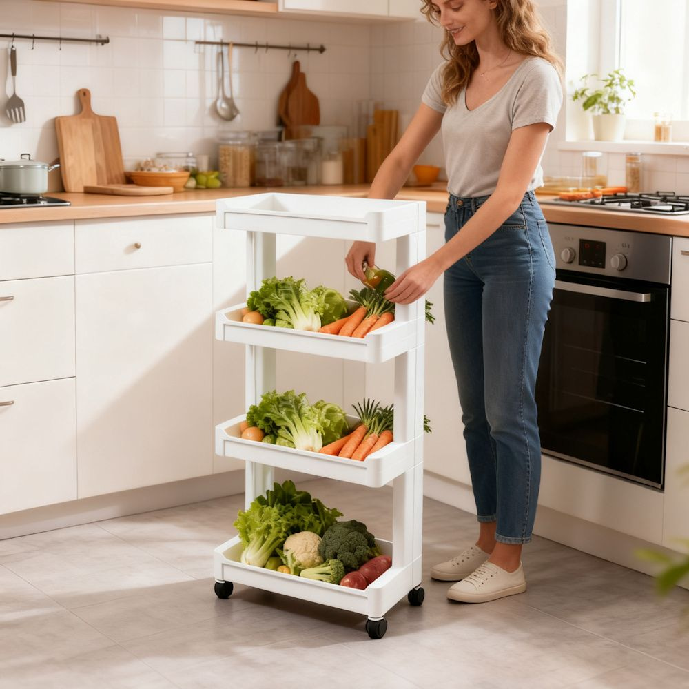 Te gebruiken als keukentrolly in uw keuken, om bijvoorbeeld uw extra voorraad, specerijen etc in op te bergen. Ook zeer geschikt als badkamerrek om uw shampoo, handdoeken, toilet spullen etc in op te bergen. Het rekje is erg praktisch doordat er 4 niveaus voor opslag mogelijk zijn.