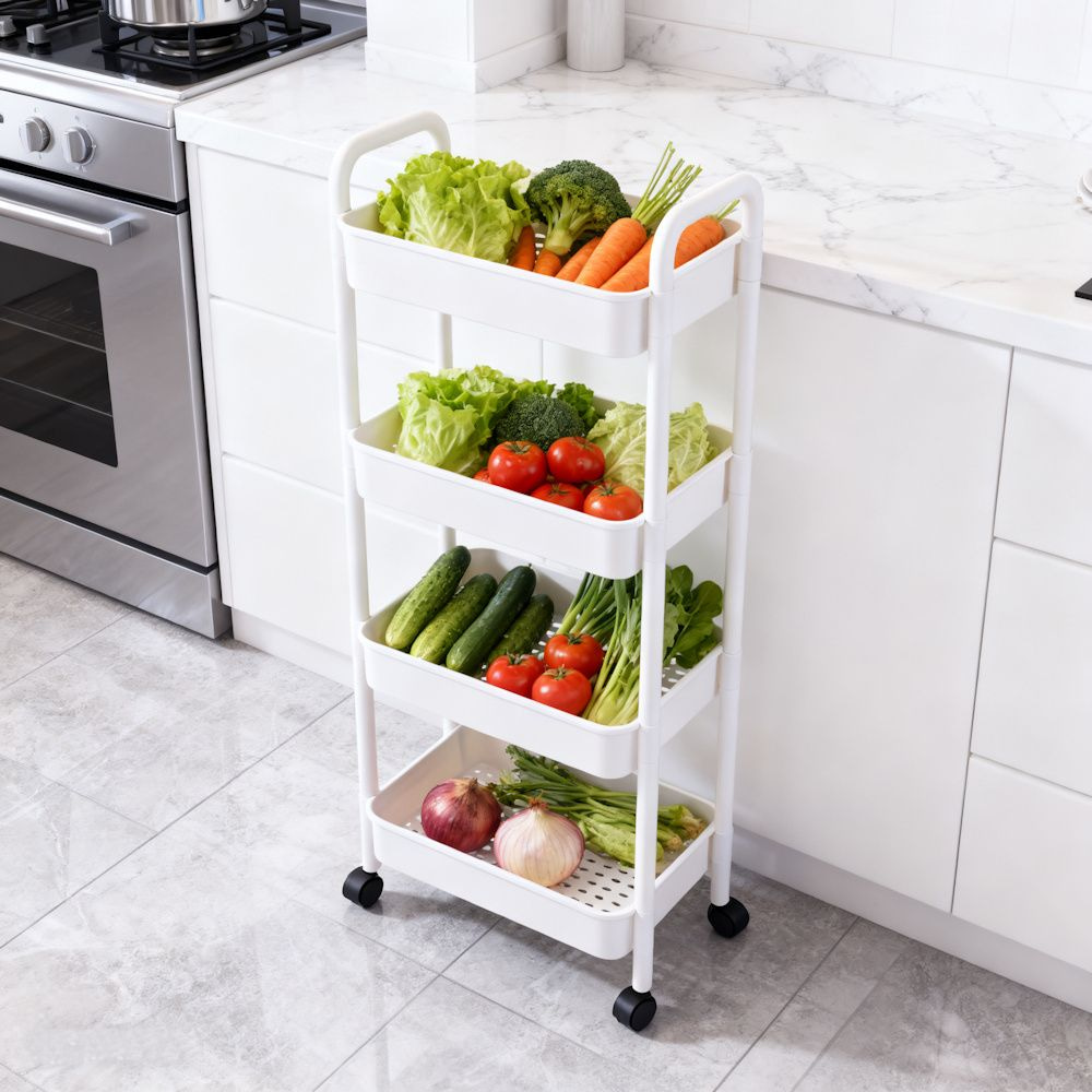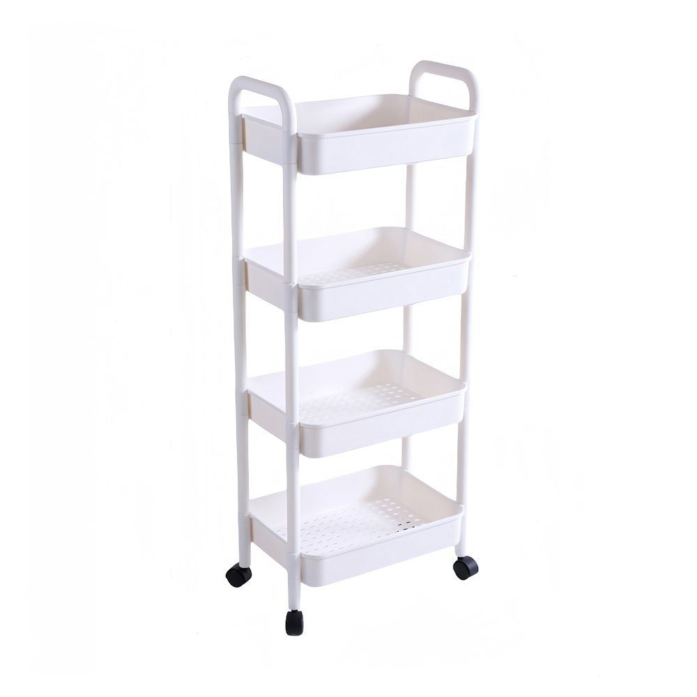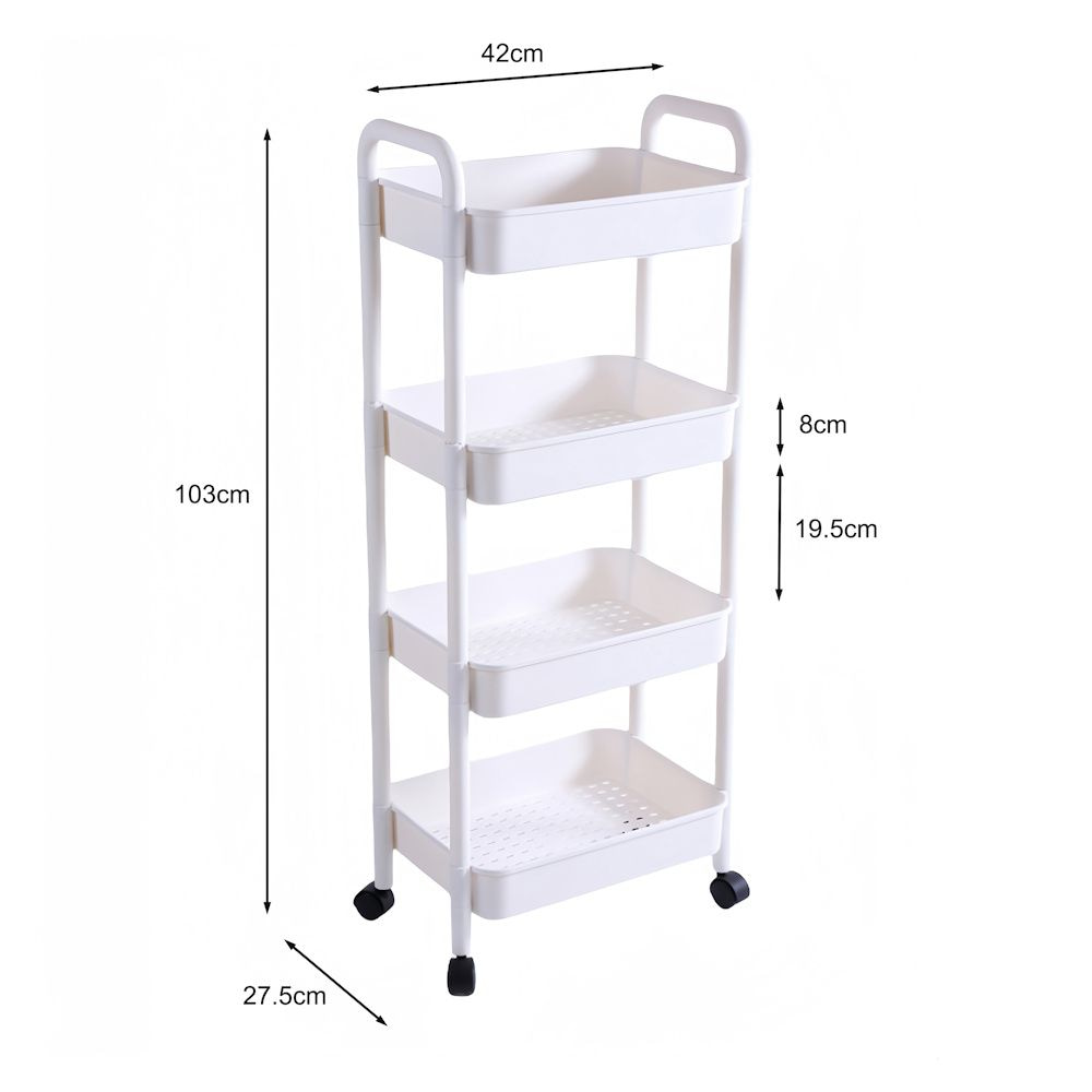 Te gebruiken als keukentrolly in uw keuken, om bijvoorbeeld uw extra voorraad, specerijen etc in op te bergen. Ook zeer geschikt als badkamerrek om uw shampoo, handdoeken, toilet spullen etc in op te bergen. Het rekje is erg praktisch doordat er 4 niveaus voor opslag mogelijk zijn.