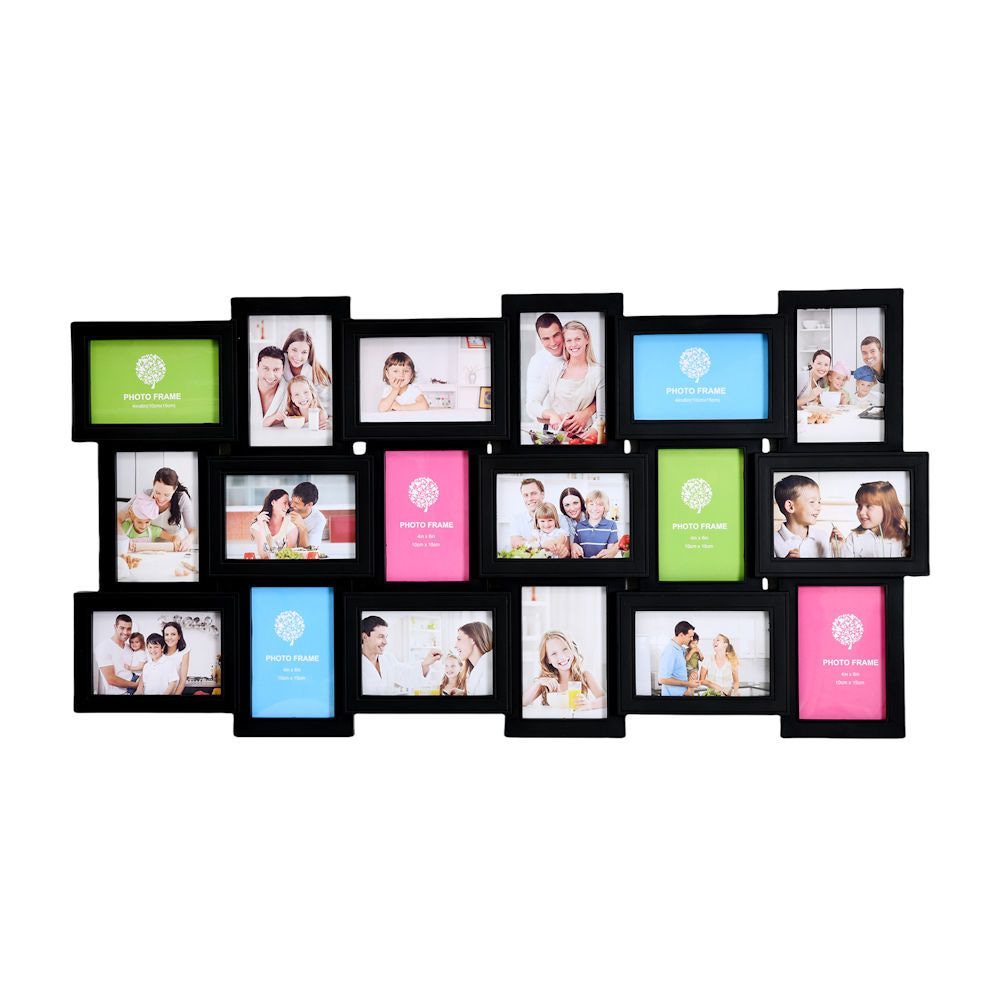 XL Foto Collagelijst voor 18 foto's van verschillende foto formaten: 10 x 15 & 15 x 10 Cm. Voor je mooiste foto's! Met stevige achterkant voorzien van wand ophanghaak en gemaakt van kunststof. Dankzij de ophang haken aan de achterkant kan je zelf bepalen of hij verticaal of horizontaal wordt opgehangen.