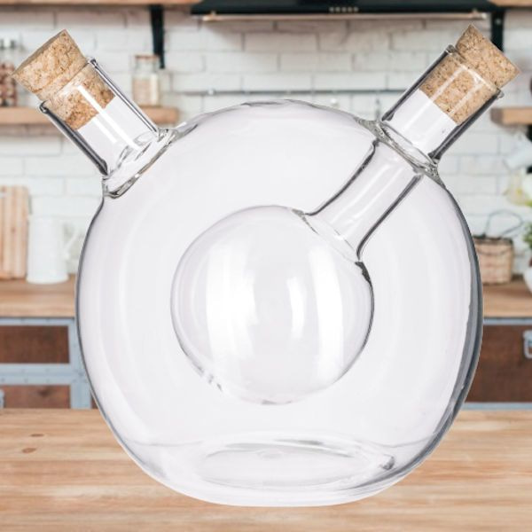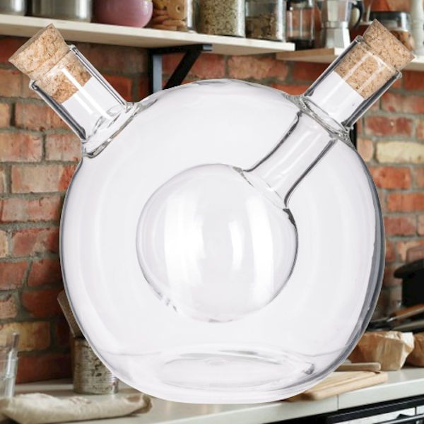 Erg originele dispenser oliefles voor olie en azijn in de vorm van twee ronde flessen die met elkaar zijn verbonden. Doordat de flessen één geheel vormen, kun je deze 2in1 glazen olie en azijn stel eenvoudig ruimtebesparend opbergen. Ideaal voor het bereiden van eten en het serveren van maaltijden op tafel. Dit design is een echte eye catcher.