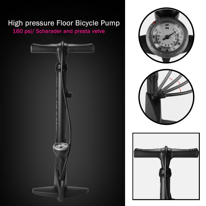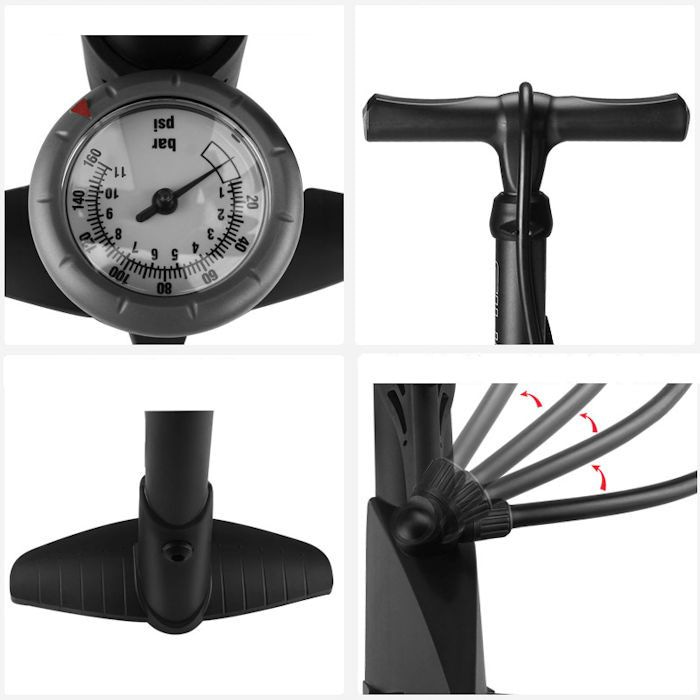 Als je geen zin hebt, om met ongemakkelijk fietspompen te werken, dan is deze PRO fiets luchtpomp met drukmeter de juiste keuze voor u. Hiermee bespaar je veel tijd, of je er nu je fiets, racefiets, of mountainbike wiel mee wilt oppompen. Na gebruik hang je de lucht slang gewoon in de houder om hem weer snel op te bergen. De dubbele ventielkop is voor alle ventielen geschikt. Om meer te weten over de druk, dan is het genoeg om op de analoge manometer te kijken.